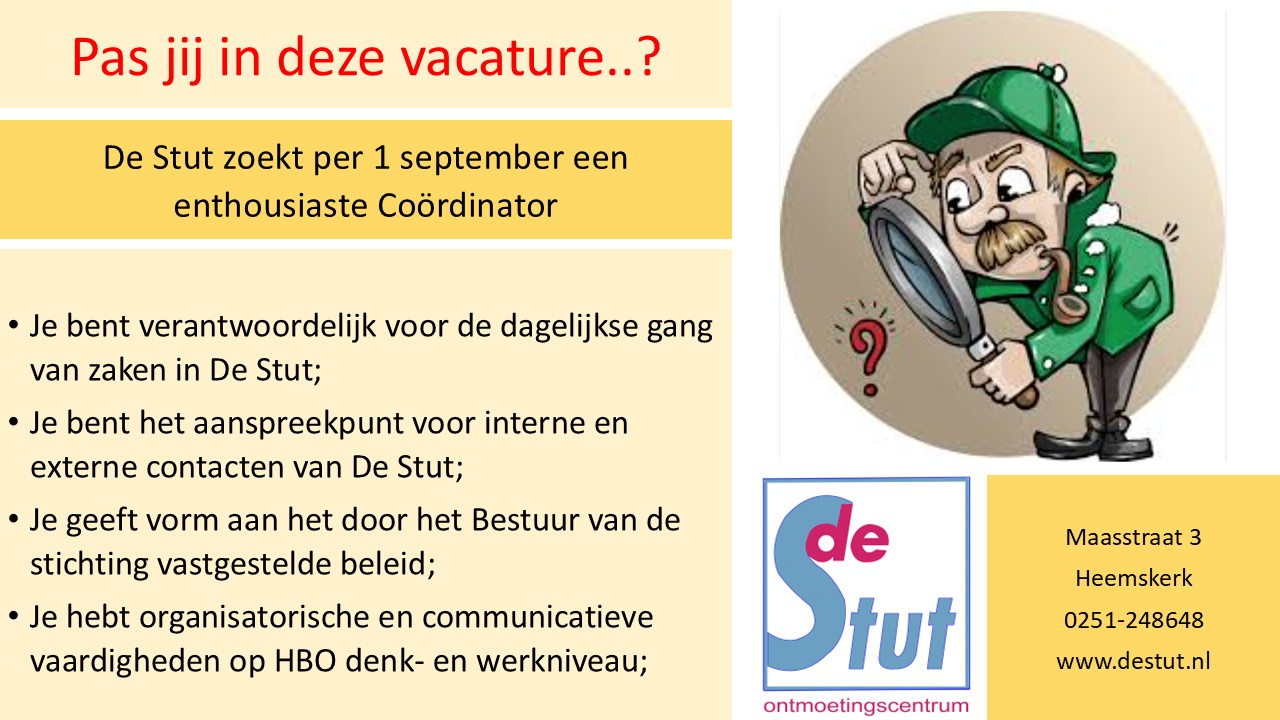 Als huidige of toekomstige gebruiker van De Stut heten wij u van harte welkom op onze site. U vindt hier informatie over onze organisatie en dienstverlening, alsmede praktische en actuele zaken die voor u van belang kunnen zijn.