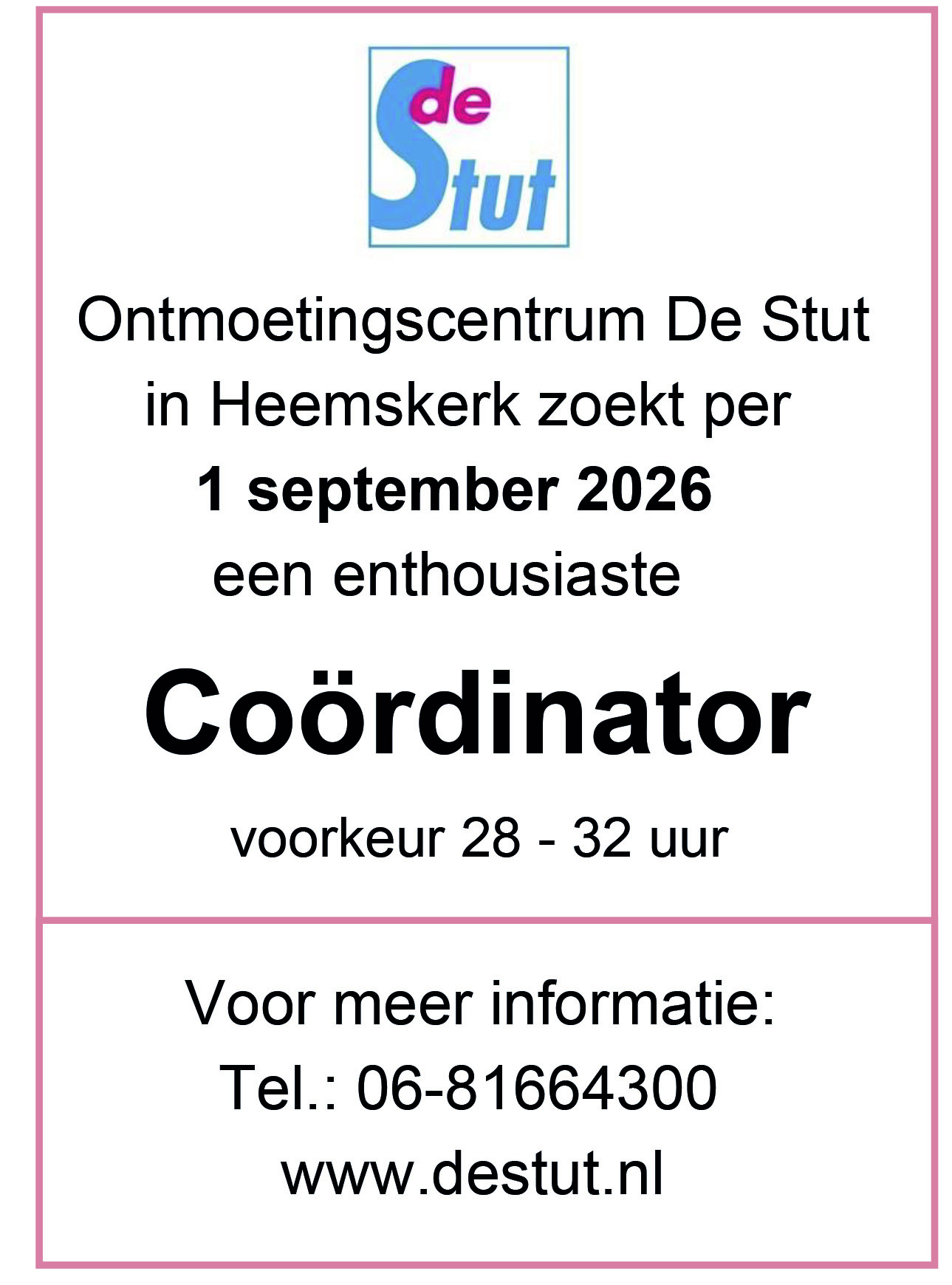 Wij zoeken per 1 september 2026 een enthousiaste, verbindende, communicatieve, oplossingsgerichte en energieke coördinator voor Ontmoetingscentrum De Stut.